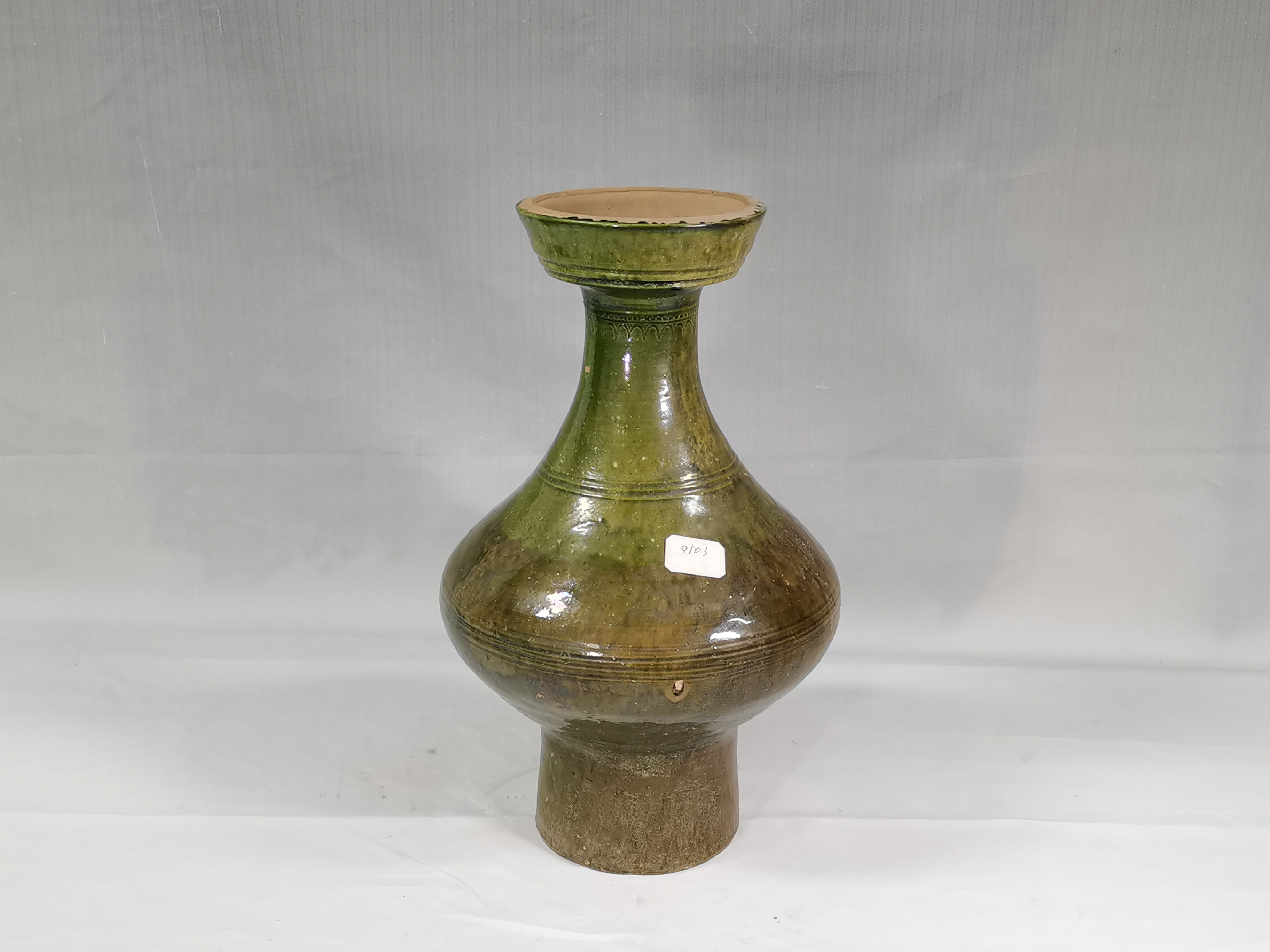 盘口壶是西汉后期至唐代流行的一种陶瓷器,因壶口似盘而得名,其制作工艺较为考究,器体与盘身分别轮制而成,然后整体粘接、修整。接缝处不易察觉,制作工艺和镶嵌工艺细致。该绿釉陶器为汉代烧制的低温铅釉陶明器,属于随葬器物范畴,体现汉代“事死如事生”的丧葬观念。在我国,低温铅釉的发明比青釉要晚得多,但在汉代已相当普遍。它的特点是釉面光泽强,表面平整光滑,釉层清澈透明,犹如玻璃一样,但硬度比较低,容易出现划痕,化学稳定性较差,传统的低温色釉的主要品种有绿、黄、蓝、红、紫等多种。汉绿釉弦纹盘口陶壶制作精美,造型端庄,釉色莹润,为汉代低温釉陶的精品之作。