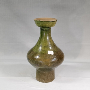 汉绿釉弦纹盘口陶壶,高45厘米,通体施绿釉,器型为盘口、细长颈、腹部像算盘珠,高圈足竖直,装饰弦纹分布于外口沿下、颈肩结合处及腹部,造型精美。